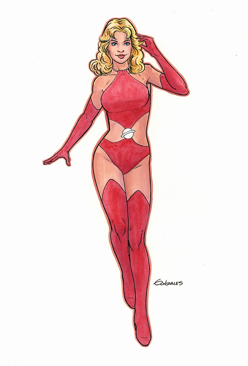Saturn girl of the Legion of Super-Heroes wearing her 1970s "bikini" outfit. Ink and acrylic ink on 11" x 16" Meeden 140# hot press watercolor paper.